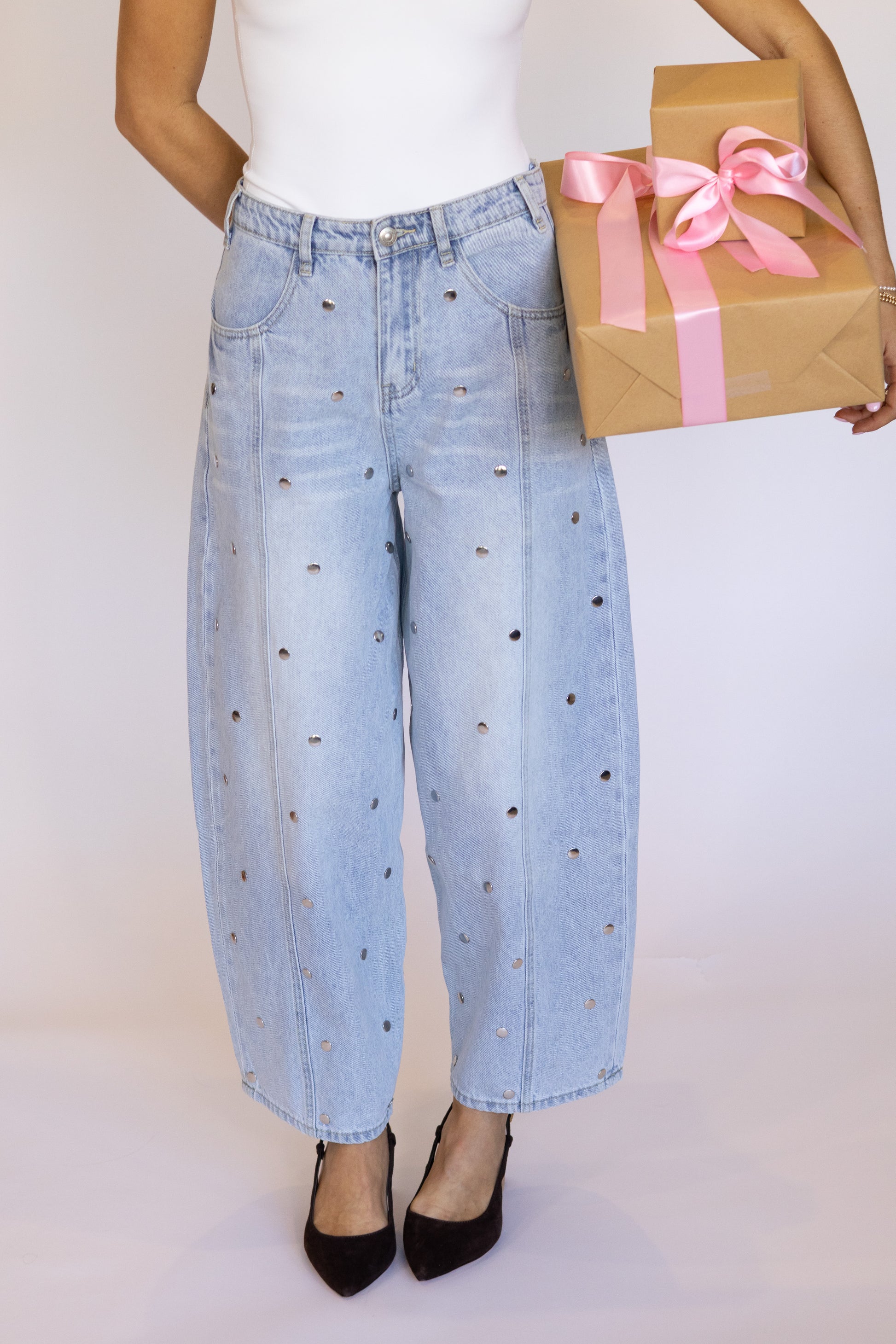 Meet your new statement jeans! The Hayden Studded Barrel Jean has a relaxed barrel-leg silhouette with stud detailing for the perfect statement. Pair with a basic top or jacket.